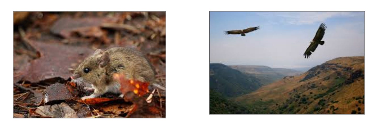 We stood up and did some physical movement to try to understand the concept. First, I asked students to pick a place in the room and walk to it directly in narrow and focused vision. We immediately noticed that in this class of 30 students we all tended to gather together in three spots– the corners of the room. Then I taught them how to go into more wide-angle or peripheral vision where instead of taking in one focal point, they would literally see differently by taking in a larger expanse and to adjust their ideas differently. They walked around the room and back to their seats. I used these images of the mouse and the eagle to reinforce the concept. (Yes, these young adult students looked at images and moved their bodies in class and they enjoyed it. This kind of teaching is not just for young children.)